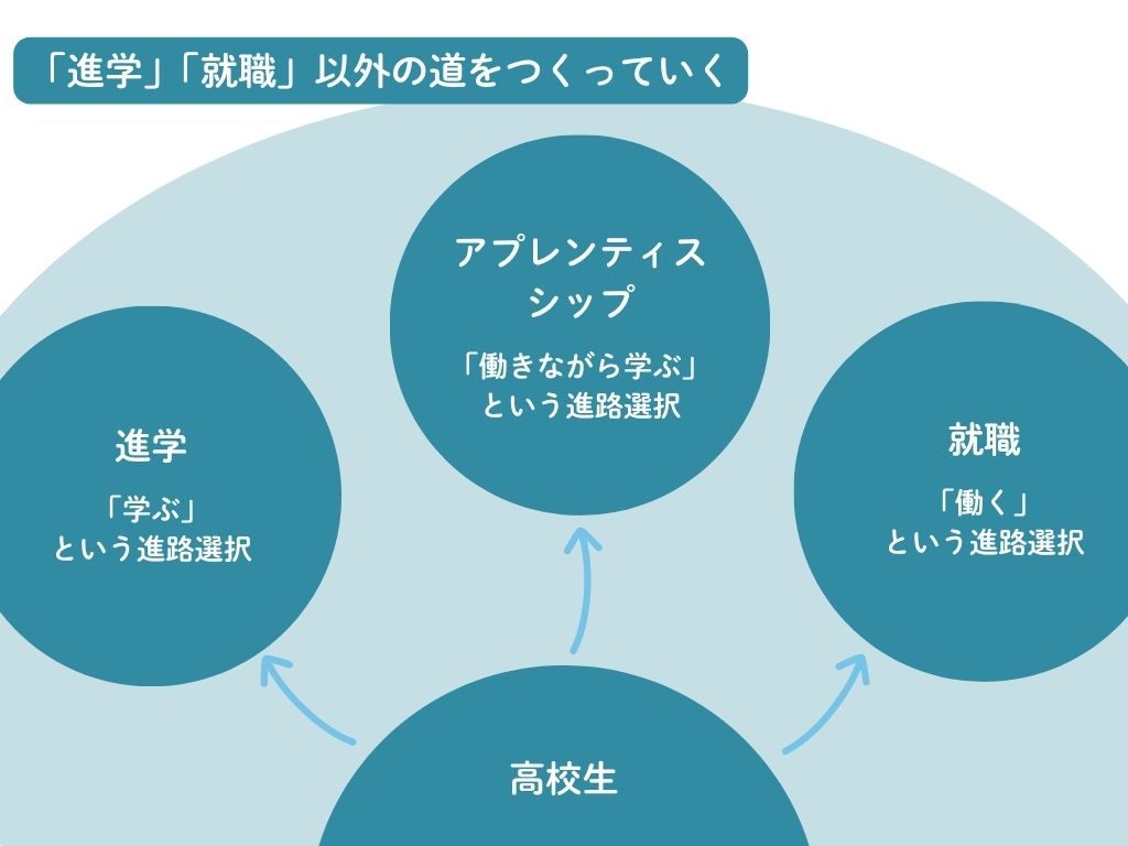 高校在学中に、アルバイトと変わらない給料をもらいながら、現場の学びを得る。または、卒業後の進路として選ぶことで、具体的なキャリア像を描き、次の選択へとつなげていく。
