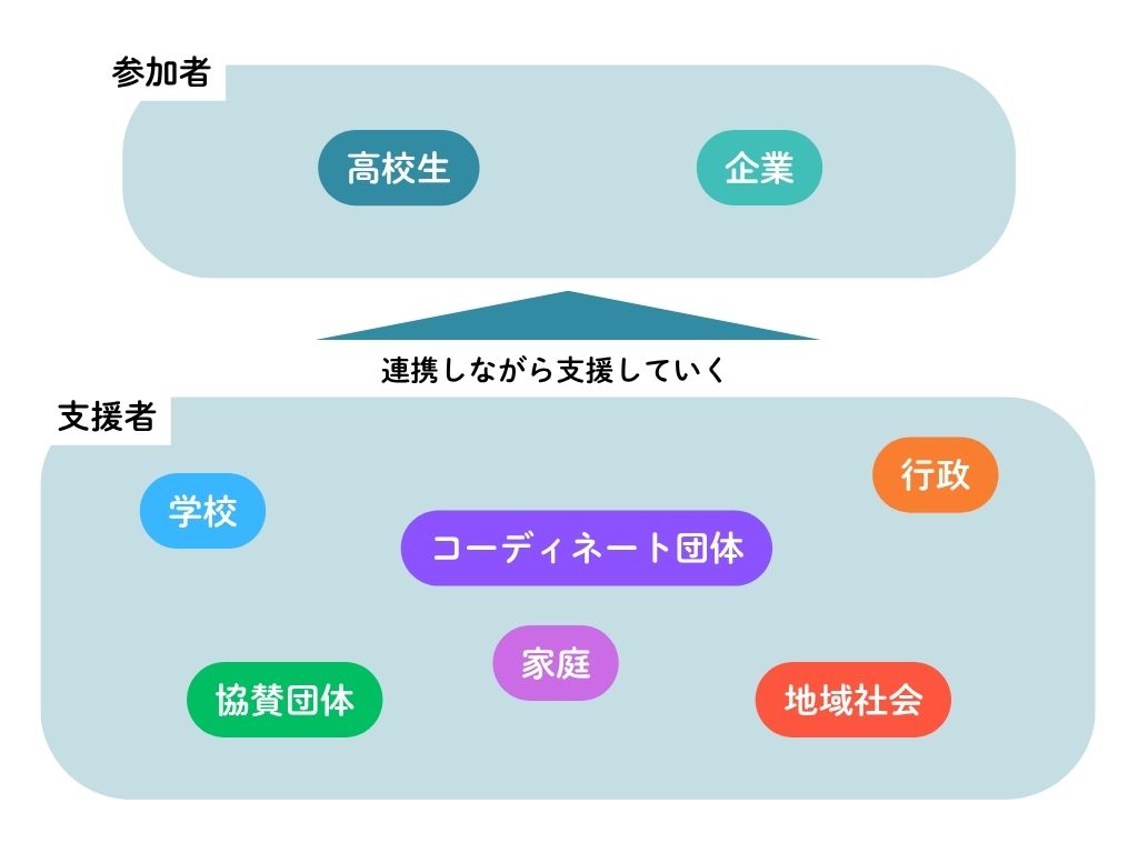 そのため、プログラム全体を運営していくコーディネーターが中心となり、実際の現場で動いていく学生さんと企業を支援する体制を築く必要があります。